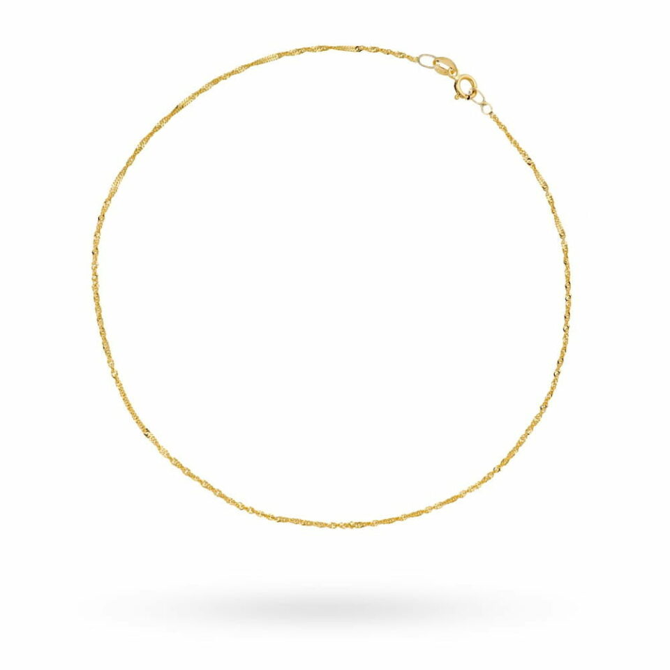 Elegancka bransoletka złota na nogę, zdobiona podwójnym splotem singapure i delikatnym diamentowym wzorem, podkreśli Twój styl z subtelnością i wyrafinowaniem. Zestaw idealny na specjalne okazje, łączący luksus i unikalną estetykę, zapewnia niezapomniane wrażenie przy każdym kroku.