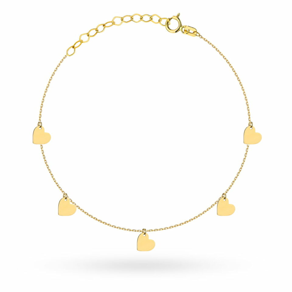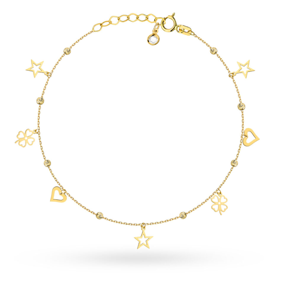 Złota bransoletka z diamentowymi kulkami i wiszącymi gwiazdkami, serduszkami oraz koniczynkami to elegancki dodatek, który podkreśli Twoją kobiecość i wyjątkowość. Idealna na specjalne okazje, dzięki niepowtarzalnemu blaskowi i finezyjnemu designowi przyciągnie spojrzenia, zachęcając do zakupów w naszym sklepie biżuteriowym.