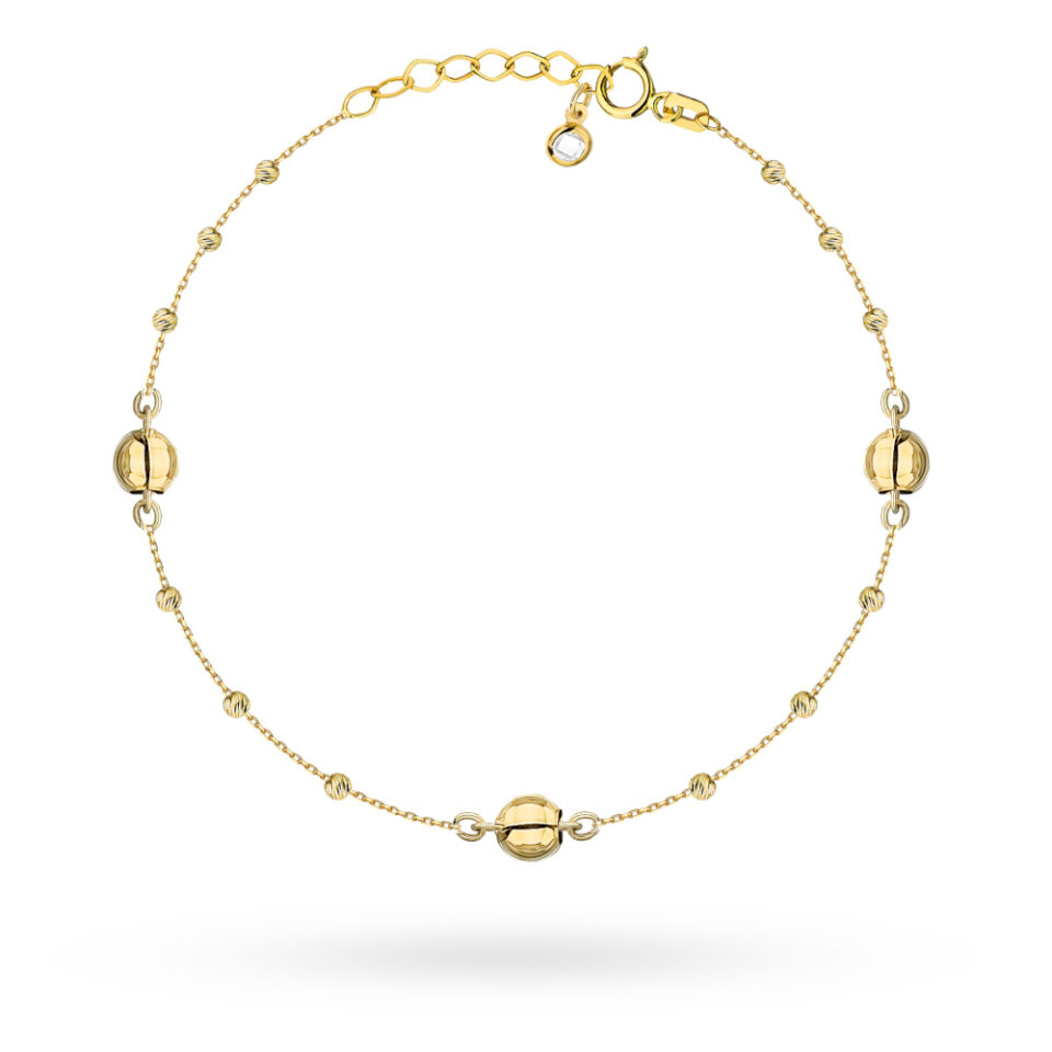 Elegancka złota bransoletka z dużymi i małymi diamentowymi kulkami, idealna na delikatny akcent przy nodze. Dodaj blasku i szyku do swojej garderoby, wybierając unikatowy design, który przyciąga spojrzenia i podkreśla indywidualny styl.