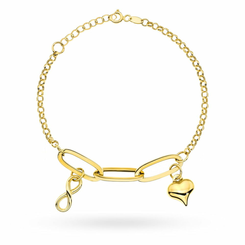 Złota bransoletka z długimi ogniwami, subtelnie zawieszona sercem i symbolem nieskończoności, emanuje elegancją i nieśmiertelnym urokiem. Idealna propozycja dla kobiet ceniących klasykę i wyrafinowany design, która podkreśli indywidualny styl każdego dnia.