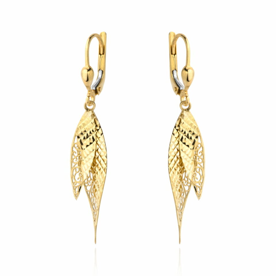 Długie kolczyki w kształcie łezki, wykonane z eleganckiego ażurowego metalu i zdobione diamentami, łączą subtelność z wyrafinowanym blaskiem. Idealne na wieczorne wyjście lub specjalną okazję, podkreślą Twój styl i dodadzą niepowtarzalnego uroku każdej stylizacji.