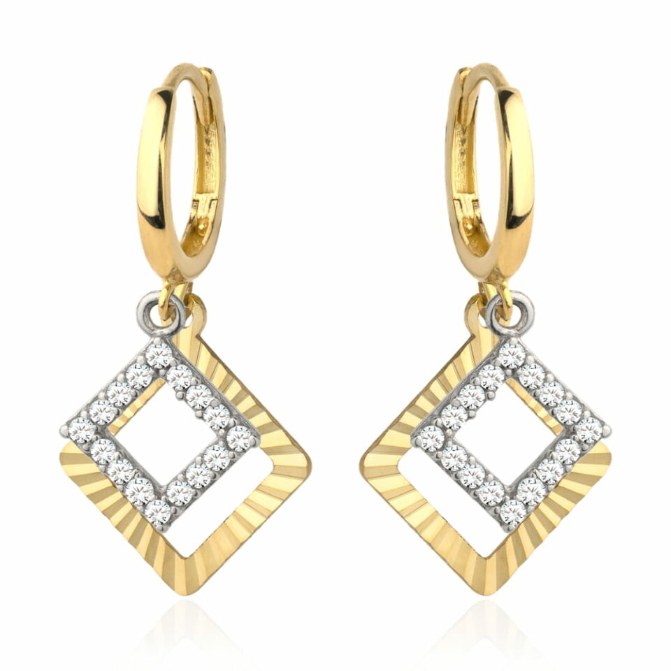 Eleganckie kolczyki w kształcie dwóch kwadracików, zdobione diamentami i cyrkoniami, idealnie podkreślą Twój styl. Wykonane z trwałego kreolu, zapewniają subtelny blask i komfort noszenia każdego dnia.