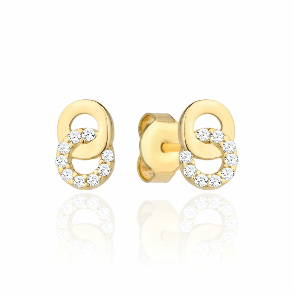 Kolczyki z dwiema splecionymi złotymi kółkami i błyszczącą cyrkonią to elegancki wybór na każdą okazję. Dodaj subtelny blask do swojego stylu i podkreśl wyjątkowość każdego momentu.