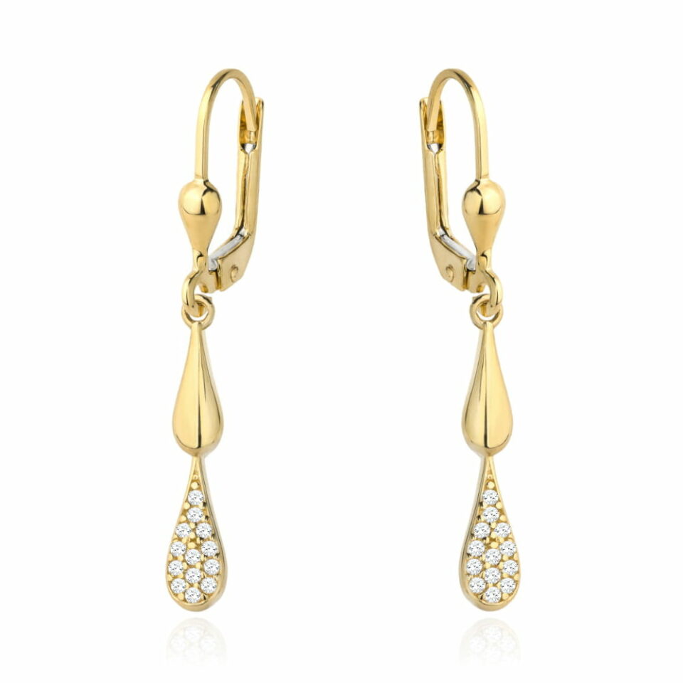 Kolczyki dwie złote krople w gładkim wykończeniu z delikatną wysadką cyrkoniami to elegancki akcent, który podkreśli każdą stylizację. Ich ponadczasowy design i wysokiej jakości materiał sprawiają, że stanowią doskonały wybór na specjalne okazje i codzienne noszenie.