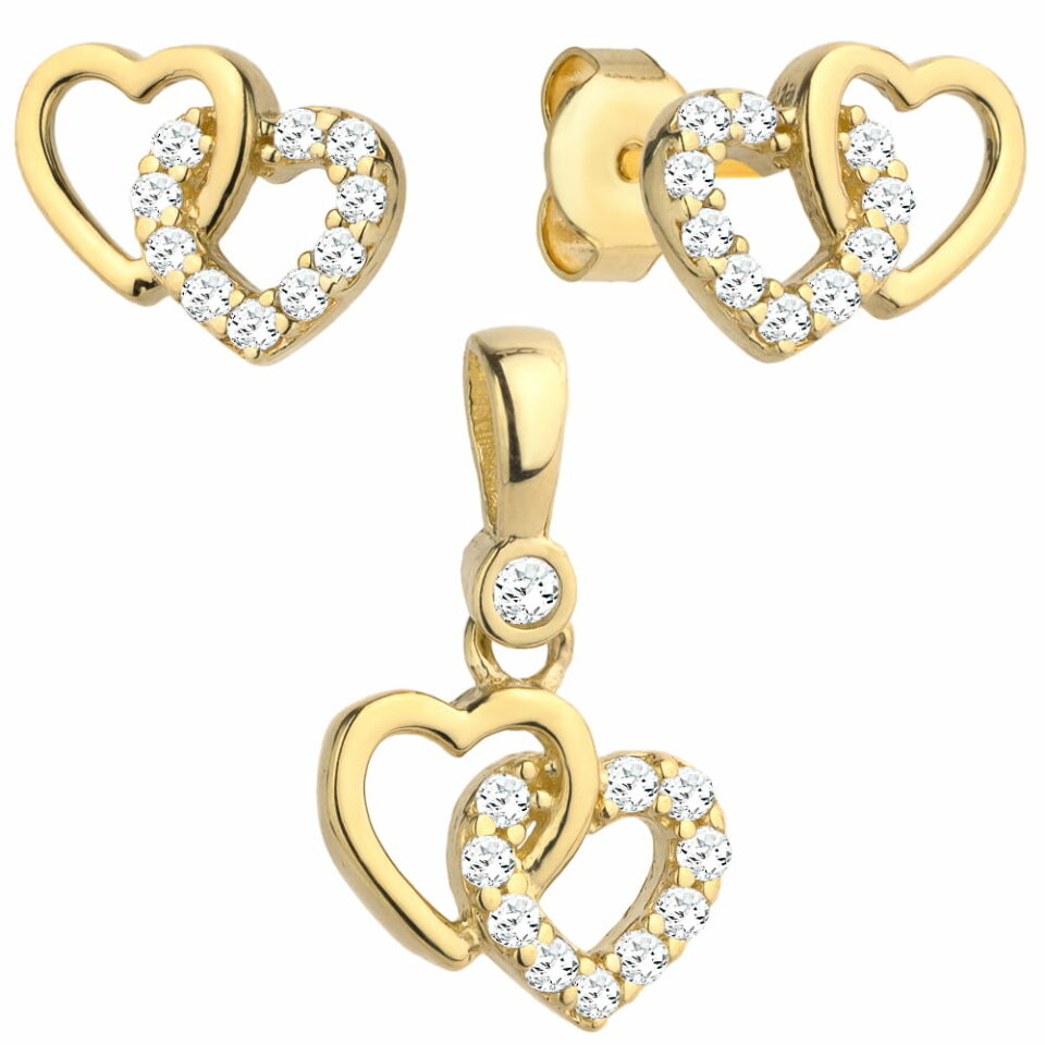 Elegancki komplet kolczyków i zawieszki z sześcioma złotymi serduszkami, w których każde serce jest wysadzone cyrkoniami, stanowi idealny akcent dla wyjątkowych okazji. Dodatkowo subtelna lśniąca cyrkonia przyciąga spojrzenia, podkreślając luksus i romantyczny charakter tej biżuterii.