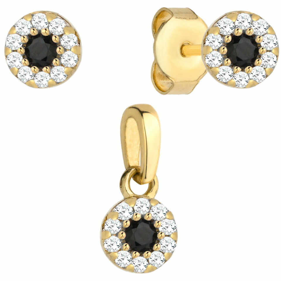 Komplet kolczyków i zawieszki z czarnym onyksem w złotych łapkach to połączenie elegancji i wyrafinowanego stylu, idealne na wieczorne wyjścia. Ozdobione subtelnie cyrkoniami, prezentuje się wyjątkowo stylowo i zachęca do podkreślenia indywidualności.