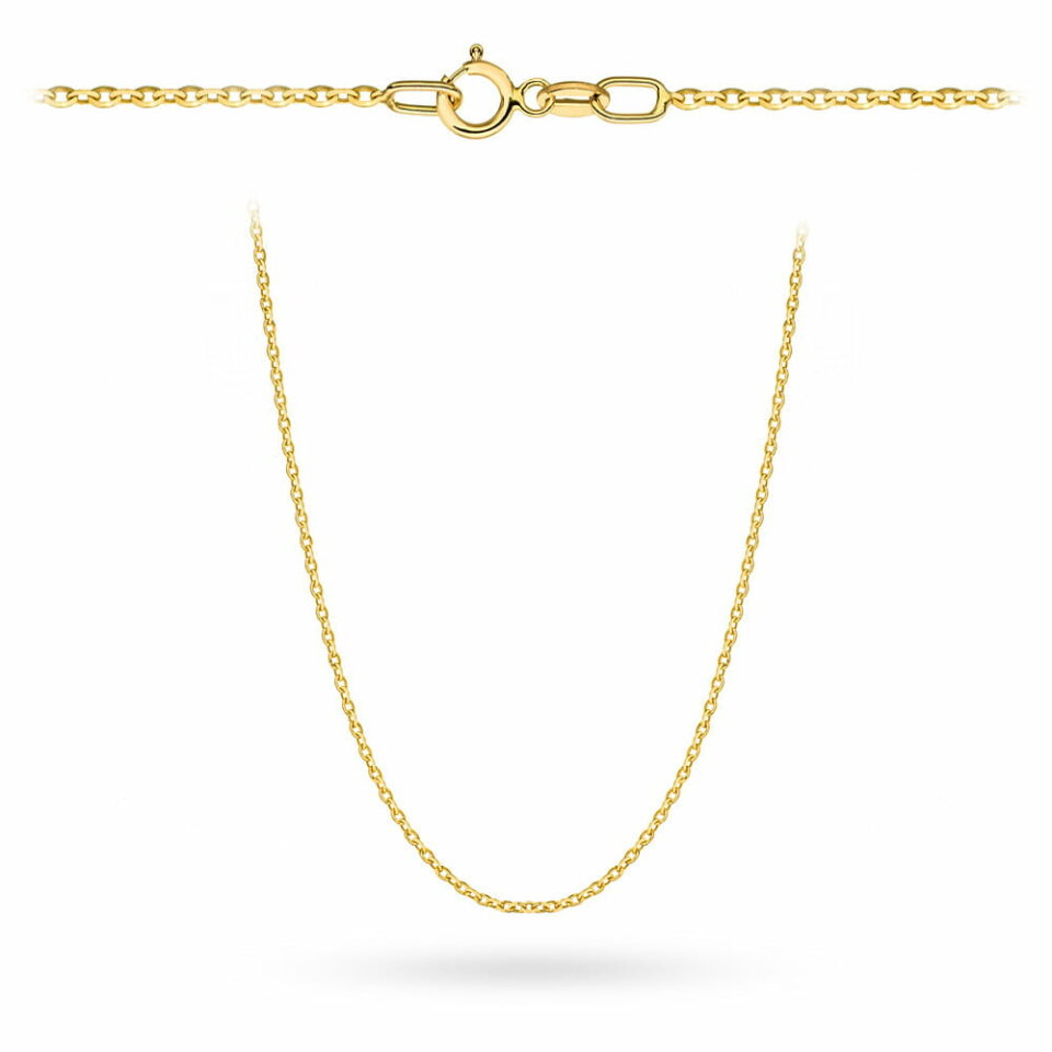 Delikatny 45‑centymetrowy złoty łańcuszek z eleganckim splotem rolo diamentowany, lekki jak piórko – idealny dodatek do codziennych i wieczorowych stylizacji. Dzięki subtelnej brylantowej fakturze podkreśla każdy ruch, a wytrzymała konstrukcja gwarantuje długotrwałe użytkowanie.