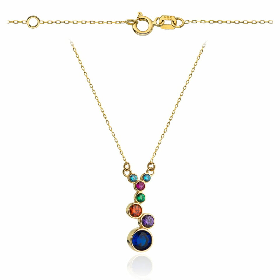 Elegancki naszyjnik Celebrytka z zawieszką ozdobioną kolorowymi kamieniami, który doda blasku każdej stylizacji. Delikatny design i subtelne kryształki sprawią, że poczujesz się wyjątkowo i z pewnością przyciągniesz spojrzenia.