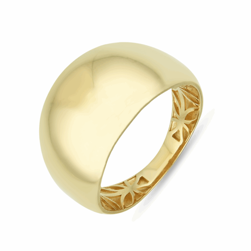 Elegancki pierścionek gładki złoty z delikatnie ażurowymi kwiatami wewnątrz, idealny na romantyczne wyjście czy codzienną elegancję. Wyjątkowy design łączy klasykę z nowoczesnością, przyciągając spojrzenia i podkreślając indywidualny styl.
