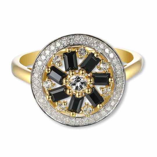 Złoty pierścionek z czarnymi spinelami, białymi topazami i diamentami to wyjątkowa biżuteria o eleganckim, wyrazistym charakterze. Kontrast głębokiej czerni spineli z blaskiem białych topazów i subtelnym połyskiem diamentów tworzy luksusową, nowoczesną kompozycję. Wykonany z wysokiej jakości złota, zachwyca precyzją wykończenia i niepowtarzalnym designem. Idealny jako ekskluzywny prezent lub efektowny dodatek podkreślający indywidualny styl.