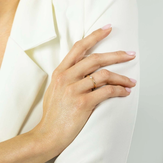 Nowoczesny złoty pierścionek z diamentami to wyjątkowe połączenie elegancji i minimalistycznego designu. Wykonany z wysokiej jakości złota, zachwyca subtelnym blaskiem starannie osadzonych diamentów, które podkreślają jego luksusowy charakter. Idealny jako pierścionek zaręczynowy, prezent na rocznicę lub stylowy dodatek do codziennych i wieczorowych stylizacji. Ponadczasowa forma i precyzyjne wykończenie sprawiają, że biżuteria zachowuje swój blask na lata.
