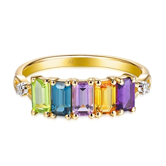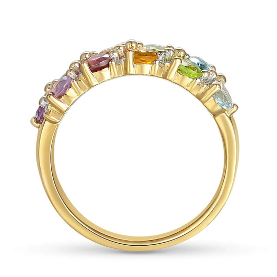 Złoty pierścionek z kolorowymi kamieniami i diamentami – luksusowa biżuteria z żółtego złota z intensywnym blaskiem kamieni szlachetnych i diamentów, idealny na prezent lub wyjątkową okazję.