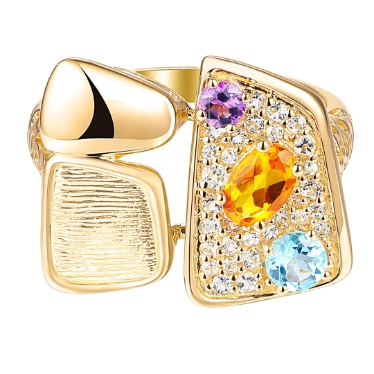 Nowoczesny złoty pierścionek z kolorowymi kamieniami i diamentami to wyjątkowa biżuteria, która łączy elegancję z modnym designem. Wykonany z wysokiej jakości złota, zachwyca blaskiem naturalnych diamentów oraz intensywnymi barwami kamieni szlachetnych. Idealny na zaręczyny, prezent lub jako luksusowy dodatek do codziennych i wieczorowych stylizacji.