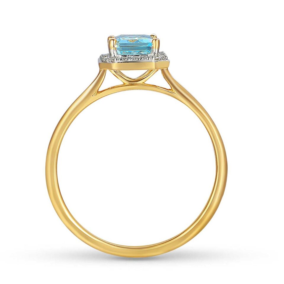Złoty pierścionek z niebieskim topazem i diamentami to elegancka biżuteria pełna blasku i klasy. Szlachetne kamienie w połączeniu ze złotem tworzą wyjątkowy dodatek idealny na prezent lub wyjątkową okazję.