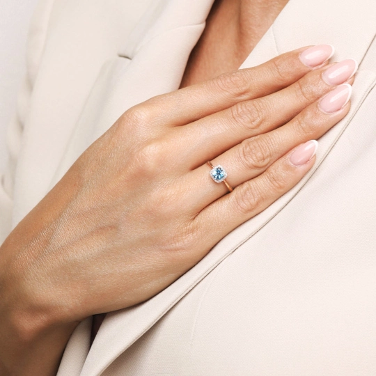 Elegancki pierścionek z diamentami i niebieskim topazem, który zachwyca blaskiem i ponadczasowym stylem. Połączenie luksusu, klasy i precyzyjnego wykonania.Szlachetne kamienie podkreślają wyjątkowy charakter biżuterii, czyniąc ją idealnym wyborem na zaręczyny lub inne wyjątkowe okazje.