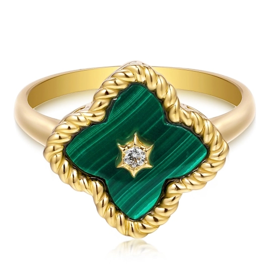 Wyjątkowy złoty pierścionek damski z naturalnym malachitem i subtelnym diamentem to połączenie klasy, luksusu i nowoczesnego stylu. Intensywna zieleń kamienia pięknie kontrastuje ze złotem, a delikatny diament dodaje blasku. Idealny na prezent dla kobiety lub jako elegancki dodatek do codziennych i wieczorowych stylizacji. Postaw na ponadczasową biżuterię, która przyciąga spojrzenia.