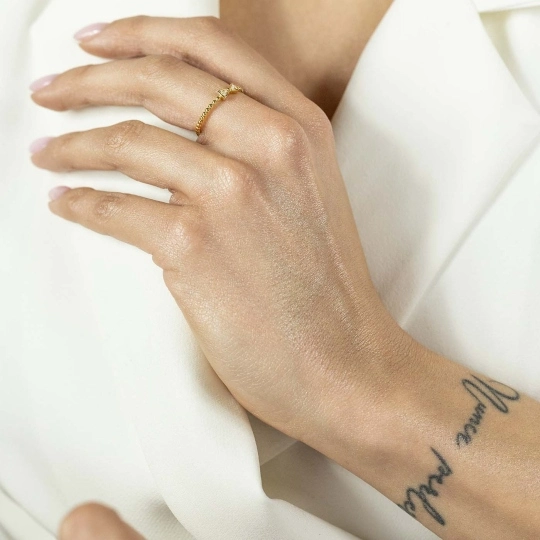 Delikatny złoty pierścionek z diamentami w motywie kokardki to subtelna i elegancka biżuteria o wyjątkowym uroku. Wykonany z wysokiej jakości złota, ozdobiony lśniącymi diamentami, zachwyca finezyjną formą i kobiecym stylem. Idealny na prezent lub jako romantyczny akcent na co dzień.