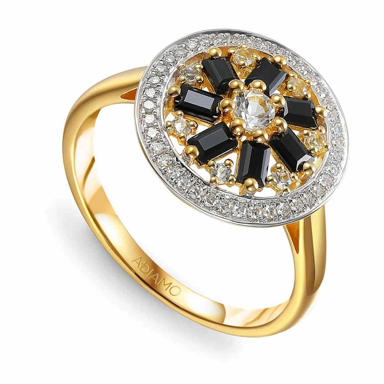 Pierścionek z czarnymi spinelami, białymi topazami i diamentami
