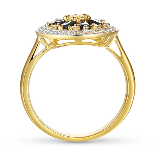 Złoty pierścionek z czarnymi spinelami, białymi topazami i diamentami to wyjątkowa biżuteria o eleganckim, wyrazistym charakterze. Kontrast głębokiej czerni spineli z blaskiem białych topazów i subtelnym połyskiem diamentów tworzy luksusową, nowoczesną kompozycję. Wykonany z wysokiej jakości złota, zachwyca precyzją wykończenia i niepowtarzalnym designem. Idealny jako ekskluzywny prezent lub efektowny dodatek podkreślający indywidualny styl.
