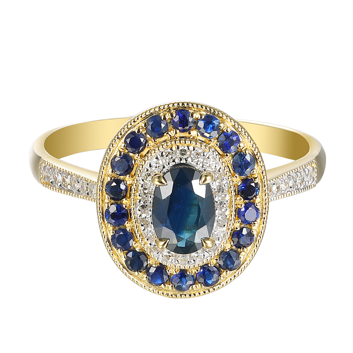 Elegancki pierścionek z szafirami i diamentami, łączący głębię niebieskich kamieni z ponadczasowym blaskiem diamentów . Wyjątkowa biżuteria o luksusowym charakterze, idealna na prezent, zaręczyny lub wyjątkową okazję.