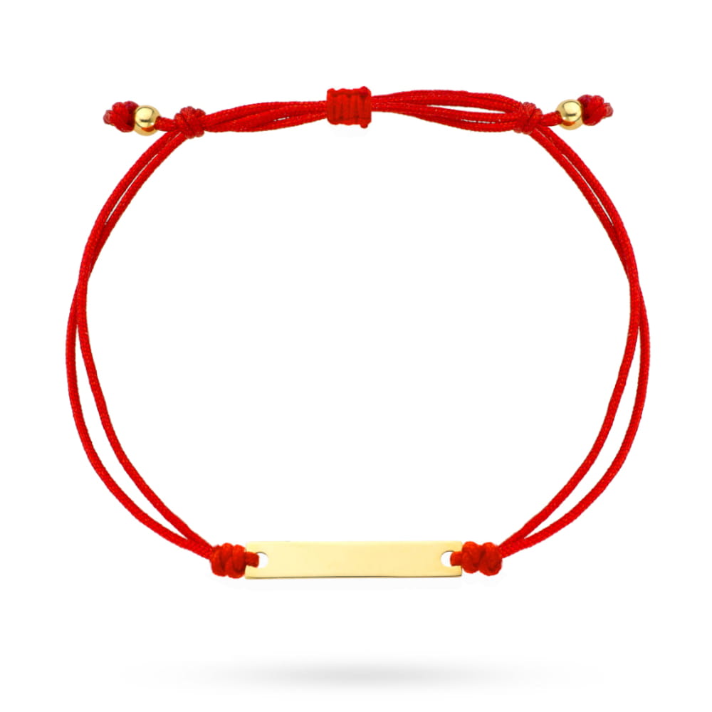 Elegancka bransoletka z złotej blaszki, idealna do personalizacji grawerem i podkreślenia indywidualnego stylu. Czerwony sznurek dodaje wyrazistego kontrastu, sprawiając, że biżuteria wyróżnia się na tle innych unikatowych dodatków.