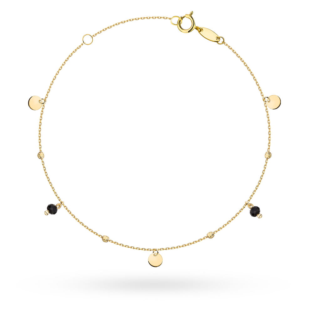 Elegancka bransoletka złota z diamentowymi kulkami i pełnymi kółkami, podkreślona czarnymi kamieniami, tworzy niepowtarzalny kontrast i dodaje blasku każdej stylizacji. Idealna na specjalne okazje lub jako wyrafinowany dodatek codzienny, zachwyci swoim klasycznym urokiem i luksusowym wykończeniem.