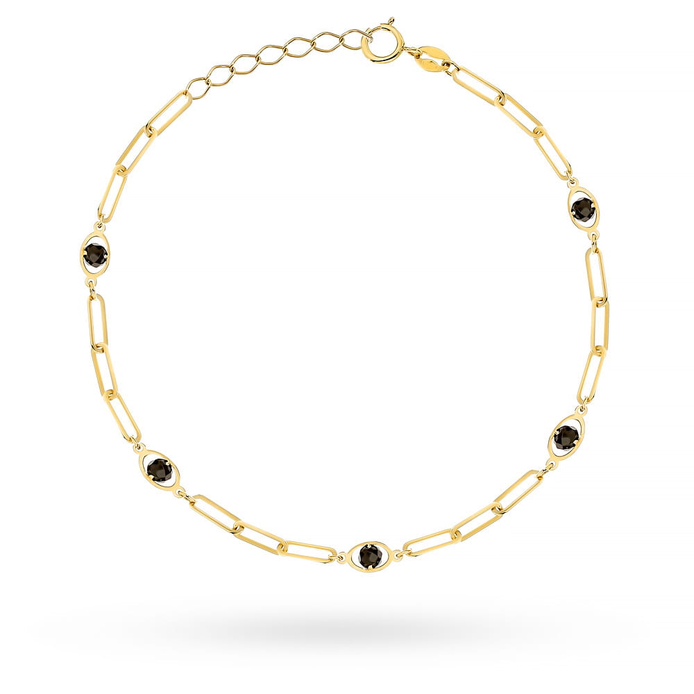 Elegancka bransoletka z długich ogniw złota, zdobiona subtelnymi owalami i wyrazistymi czarnymi kamieniami, to połączenie klasyki z nowoczesnym wyrafinowaniem. Jej delikatna struktura przyciąga spojrzenie, a ciepłe złoto rozświetla każdy ruch. Czarne kamienie dodają dramatyzmu, podkreślając indywidualność noszącej. Ta biżuteria to wyraz luksusu i niepowtarzalnego piękna, który stanie się Twoim codziennym akcentem.