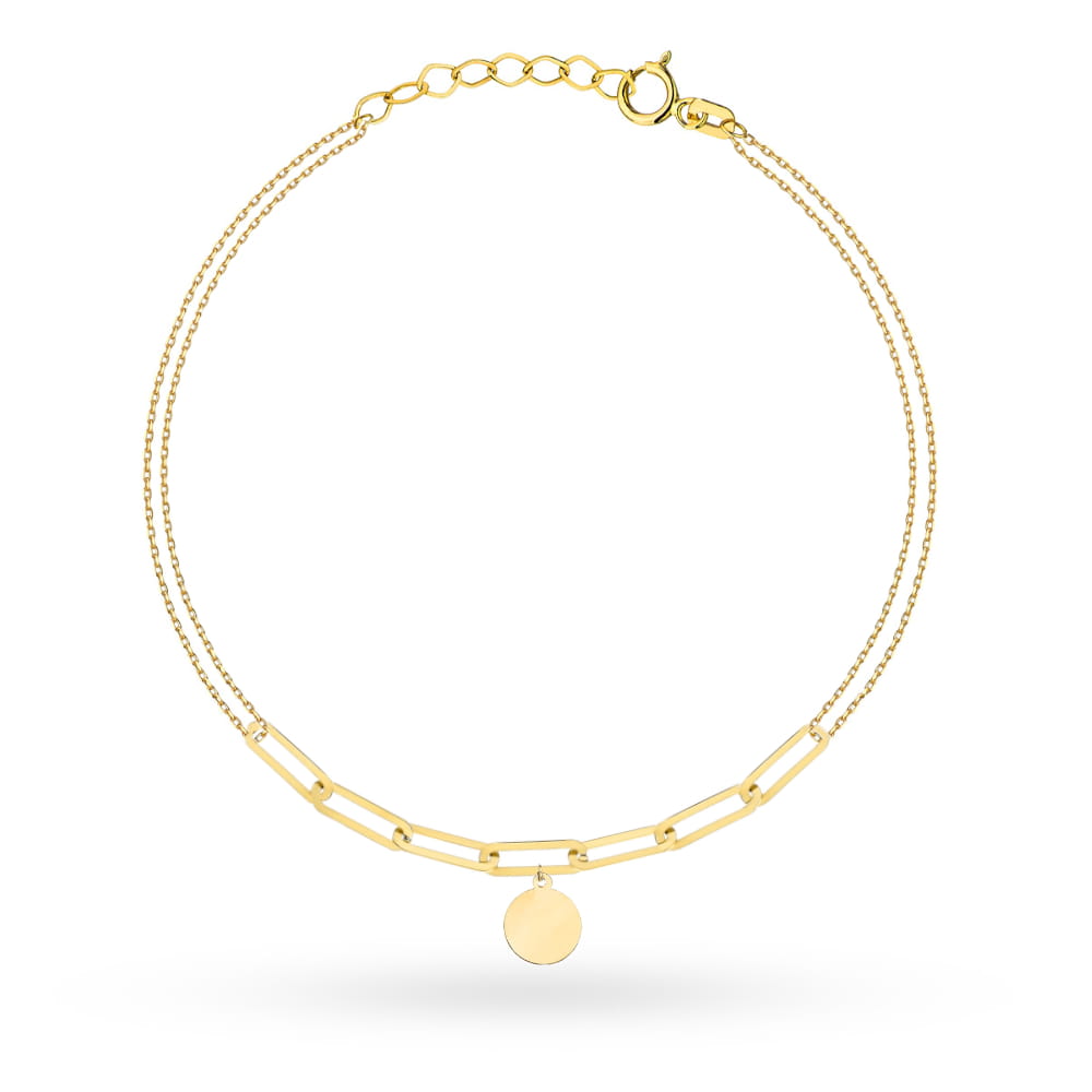 Zanurz się w niezwykłej elegancji tej złotej bransoletki, która subtelnie podkreśla każdą sylwetkę. Jej podwójny łańcuszek z długimi ogniwami emanuje delikatnym, a jednocześnie wyrazistym blaskiem, idealnie łącząc klasykę z nowoczesnym designem. Pełne kółko, będące centralnym elementem, przyciąga spojrzenia i dodaje całości romantycznego uroku. Ta biżuteria to nie tylko akcesorium, lecz wyraz osobistej elegancji i niepowtarzalnego stylu