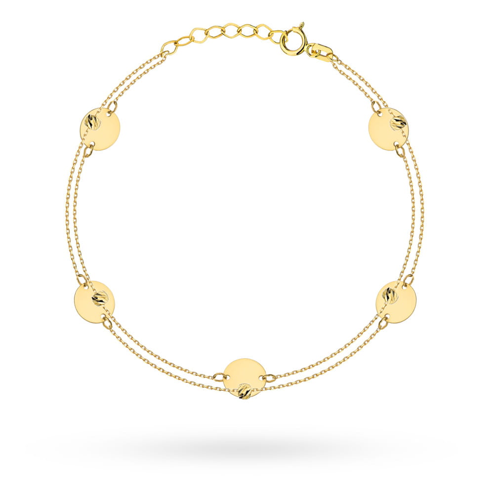 Elegancka bransoletka z łańcuszka podwójnego, zdobiona pełnymi kółkami i diamentowymi kulkami, która podkreśli luksusowy charakter każdej stylizacji. Idealna propozycja dla miłośniczek subtelnej, ale wyrazistej biżuterii, która przyciąga spojrzenia i dodaje blasku każdemu kroku.