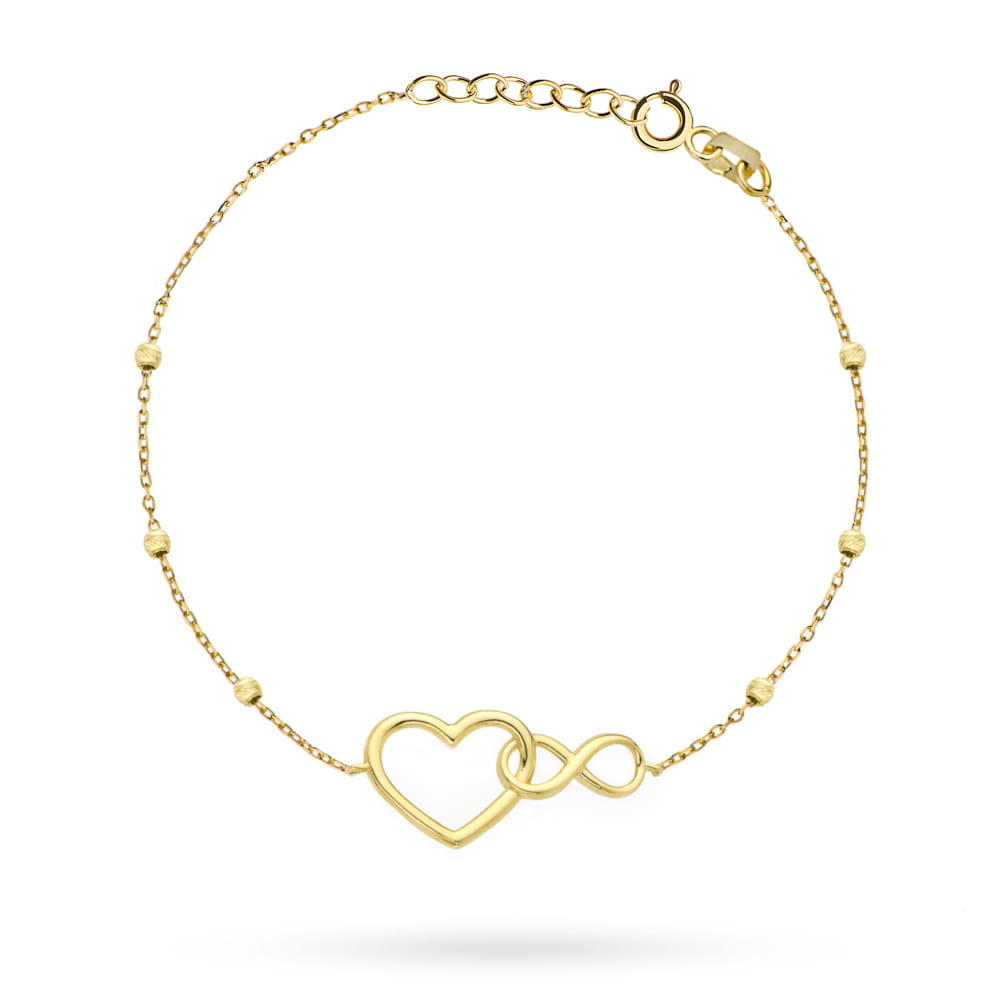 Złota bransoletka z sercem i nieskończonością, ozdobiona delikatnymi kuleczkami, to elegancki akcent, który podkreśli wyjątkowość każdej stylizacji. Dodaj jej subtelny blask do swojego looku i poczuj niekończącą się radość z noszenia ponadczasowego wyrazu miłości.