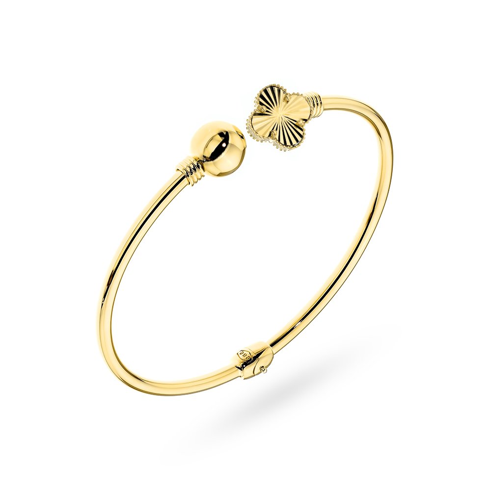 Zanurz się w świat wyrafinowanego blasku z naszą złotą, sztywną bransoletką, która zachwyca subtelnością gładkiej kulki oraz elegancką diamentowaną koniczynką. Ta unikalna kompozycja łączy klasyczną finezję z nowoczesnym designem, tworząc biżuterię, która podkreśli Twoją indywidualność i niepowtarzalny styl. Każdy detal, od precyzyjnie wypolerowanego metalu po błyszczące diamenty, został zaprojektowany z myślą o tym, abyś poczuła się wyjątkowo w każdej chwili. Odkryj luksus, który przemawia do serca i czuł się niezwykła w otoczeniu tej niesamowitej bransoletki