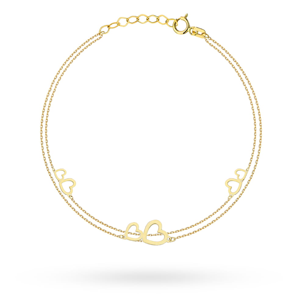 Delikatna bransoletka z złota, zdobiona trzema podwójnymi serduszkami na eleganckim łańcuszku, to idealny dodatek podkreślający kobiecą elegancję i romantyczny charakter. Wyraź swoją miłość i styl, wybierając wyrafinowaną biżuterię, która zachwyci każdego na każdą okazję.