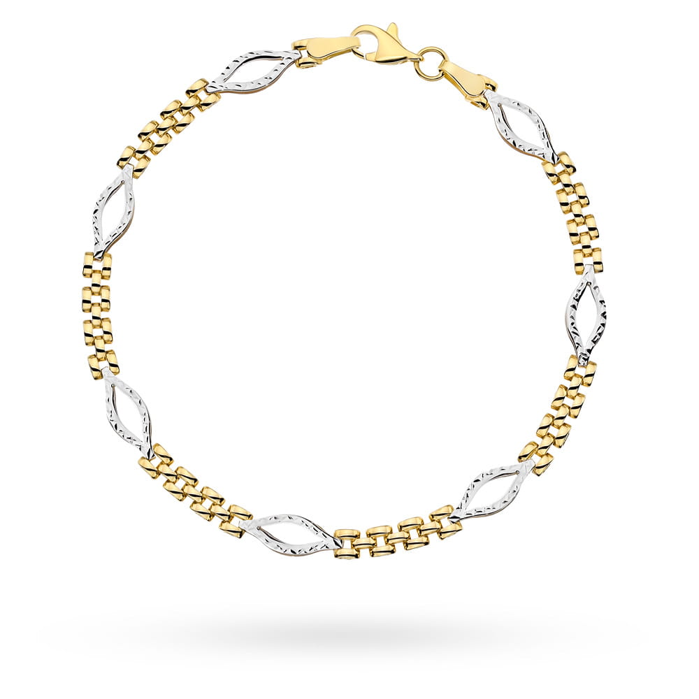 Delikatna bransoletka z złota w dwóch odcieniach, zdobiona diamentowanymi listkami, łączy klasykę z nowoczesnym blaskiem. Idealny wybór na eleganckie okazje, który podkreśli wyjątkowość Twojego stylu.