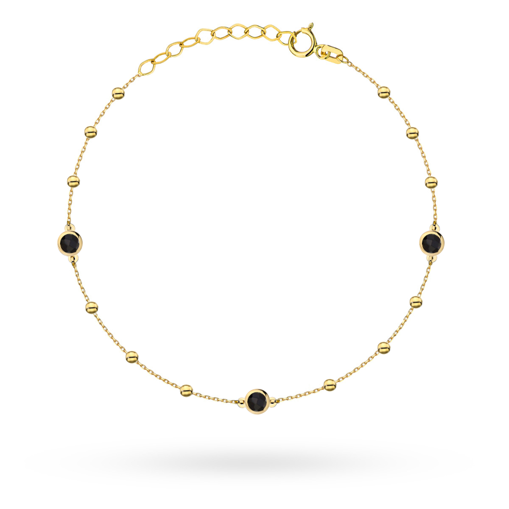 Elegancka bransoletka złota z gładkimi kuleczkami i czarnymi kamieniami, idealna na wieczorne wyjścia oraz codzienne stylizacje. Delikatny połysk metalu i kontrastujące kamienie podkreślają indywidualność, zachęcając do dodania jej do swojej biżuterii.