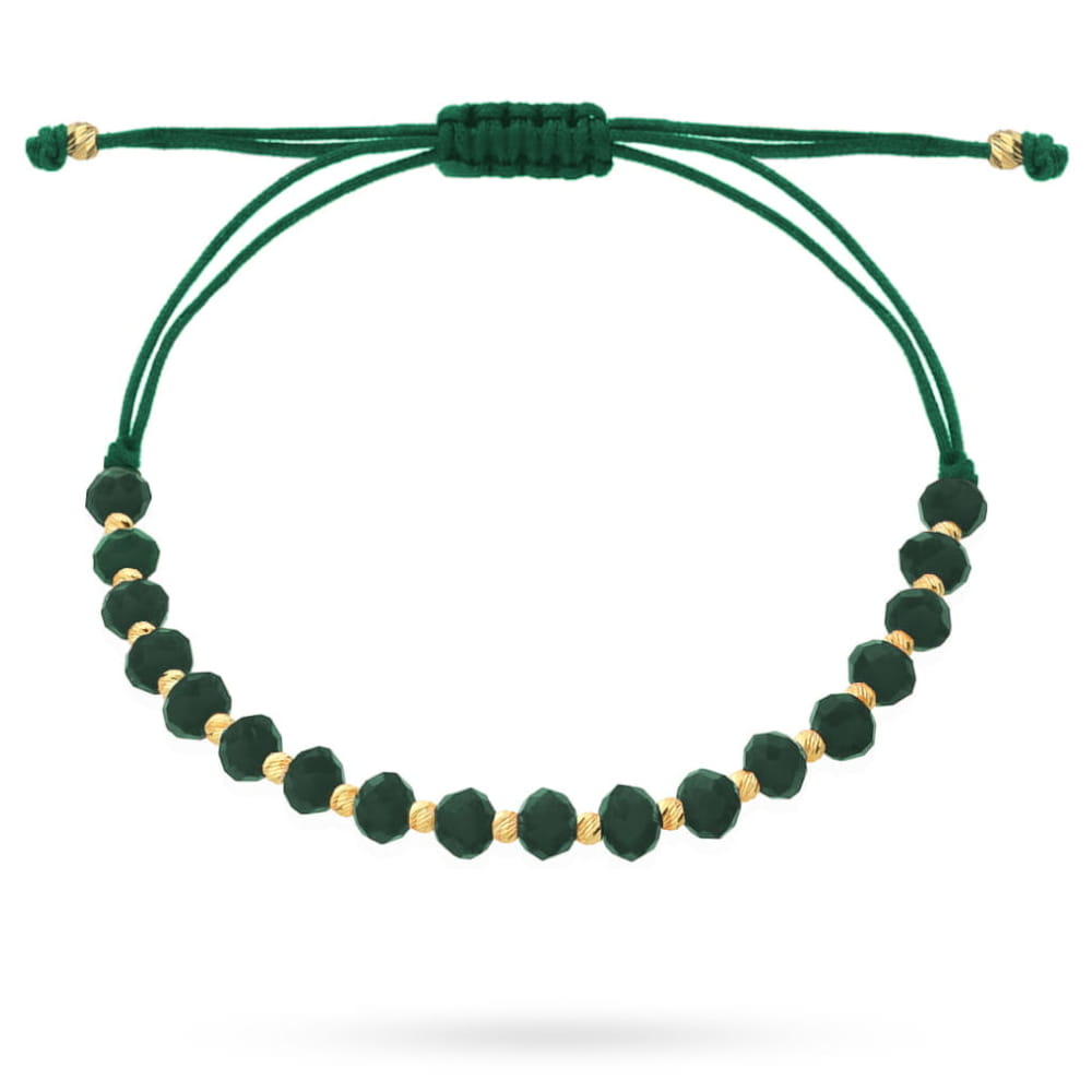 Złota bransoletka z diamentowymi kulkami i szmaragdami na zielonym sznurku to elegancki dodatek, który podkreśli wyrafinowany styl każdej kobiety. Idealna na specjalne okazje i codzienne noszenie, zachwyca subtelnością koloru i blaskiem kamieni szlachetnych.