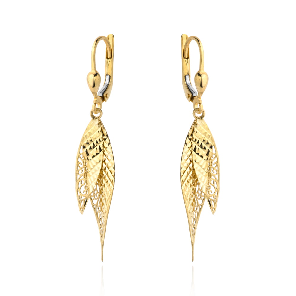 Długie kolczyki w kształcie łezki, wykonane z eleganckiego ażurowego metalu i zdobione diamentami, łączą subtelność z wyrafinowanym blaskiem. Idealne na wieczorne wyjście lub specjalną okazję, podkreślą Twój styl i dodadzą niepowtarzalnego uroku każdej stylizacji.