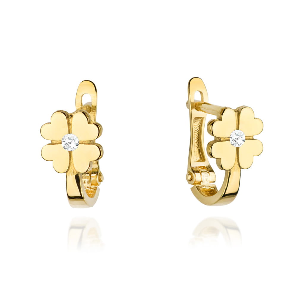 Kolczyki z czterolistną koniczyną wykonane w złocie przyciągają spojrzenia dzięki subtelnej elegancji i ponadczasowemu designowi. Delikatne białe cyrkonie w każdym detalu podkreślają ich blask, czyniąc je idealnym dodatkiem zarówno na co dzień, jak i na specjalne okazje.