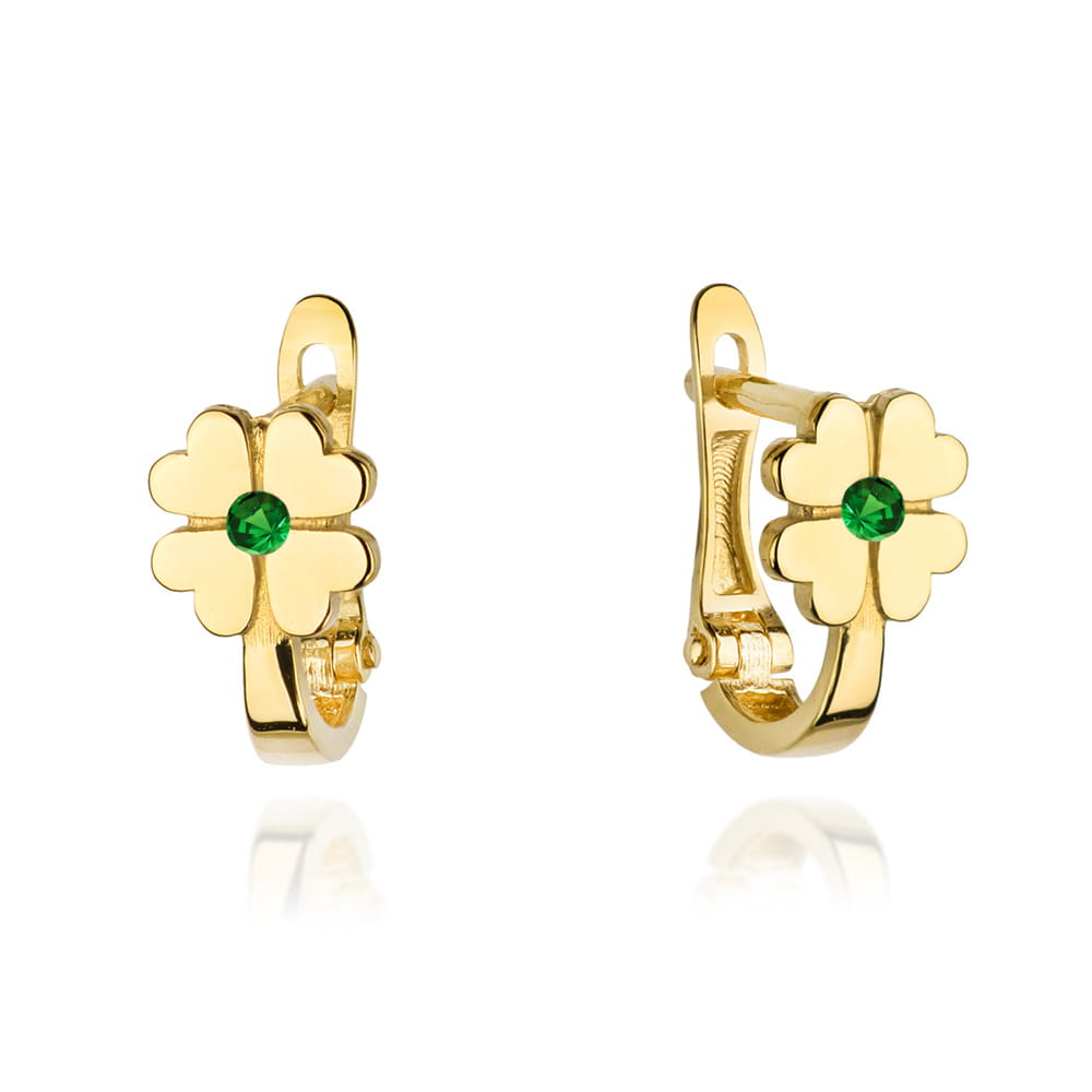 Złote kolczyki w kształcie czterolistnej koniczyny, zdobione subtelną zieloną cyrkonią, to wyrafinowany akcent dla każdej stylizacji. Ich elegancki design i delikatny blask sprawią, że poczujesz się wyjątkowo w każdej sytuacji.