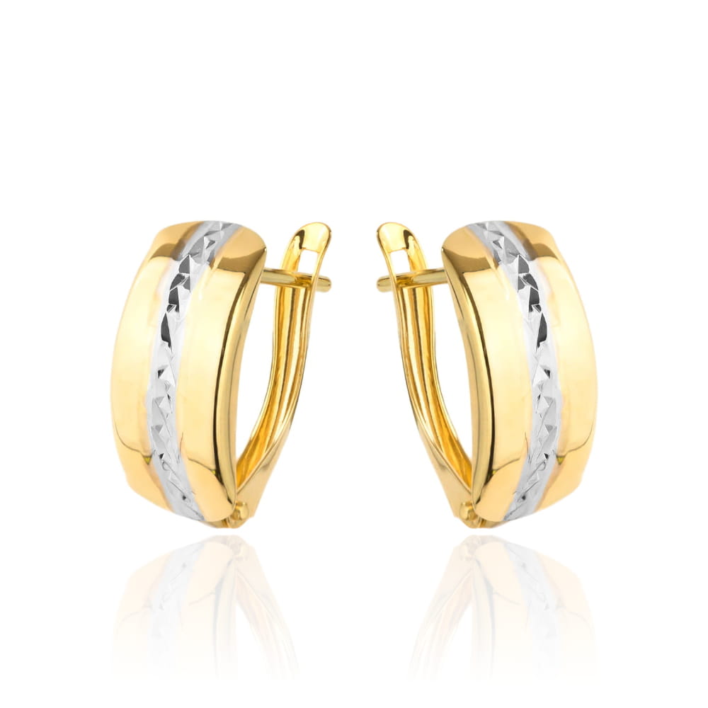 Zachwycające kolczyki złote diamentowane, które łączą elegancję i nowoczesność. Dwa odcienie złota oraz subtelne zaokrąglone kształty sprawiają, że stanowią idealny dodatek do każdej stylizacji.