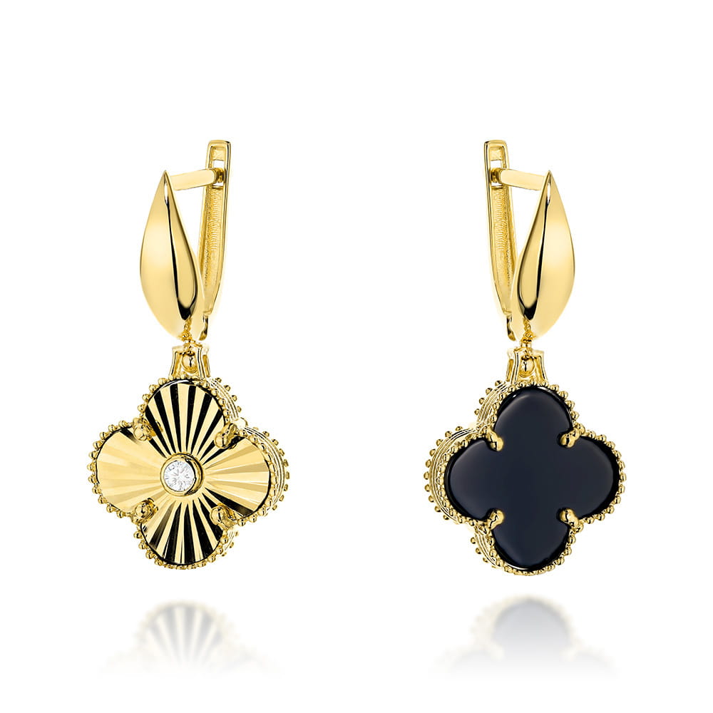 Kolczyki złote dwustronne koniczynki z czarnym kamieniem