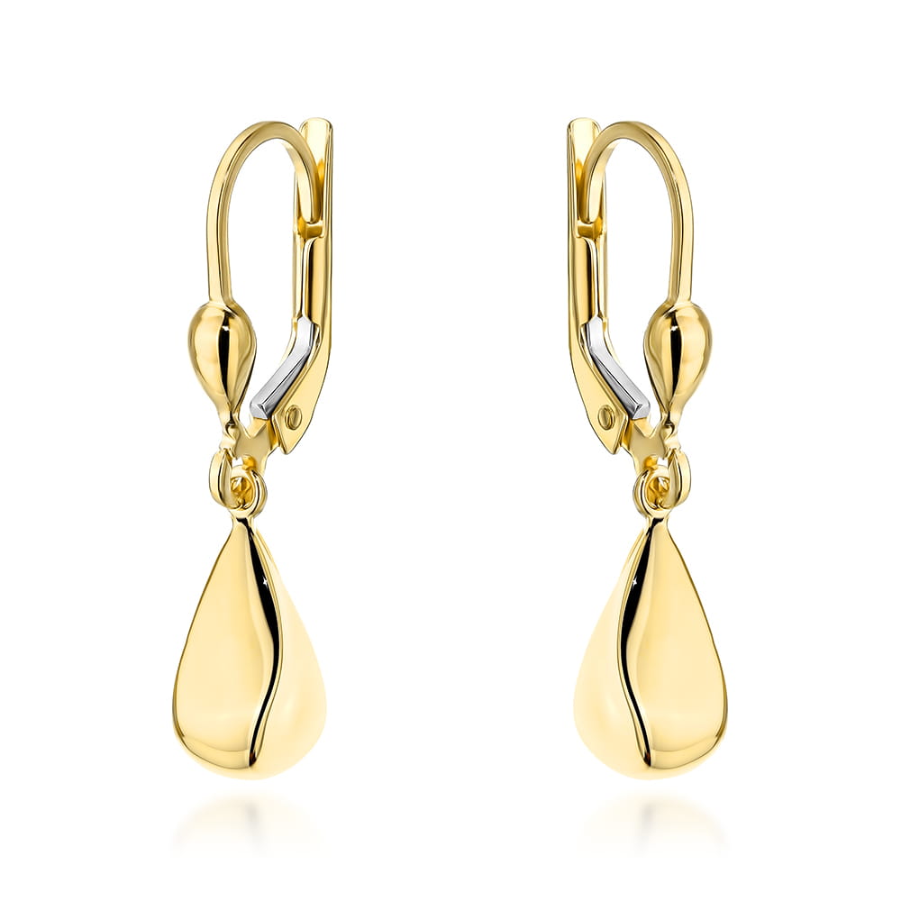 Kolczyki w złotym odcieniu, inspirowane geometrycznym designem, prezentują eleganckie łezki, które idealnie podkreślą każdą stylizację. Dzięki angielskiemu zapięciu zapewniają komfort i pewność noszenia, a ich minimalistyczny kształt sprawia, że są ponadczasowym dodatkiem do biżuterii.