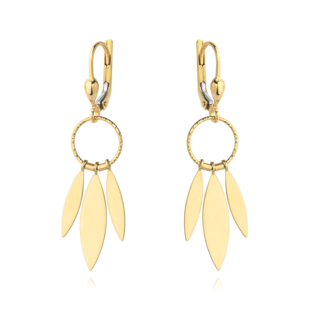 Eleganckie kolczyki z gładkimi złotymi listkami, które delikatnie oplatają diamentowane kółko, tworząc subtelny, luksusowy detal. Idealne na wieczorne wyjście czy specjalną okazję, podkreślą Twój styl i dodadzą blasku każdej kreacji.