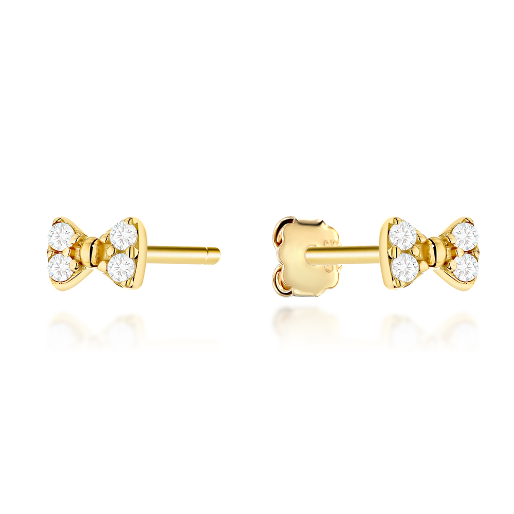 Kolczyki w stylu kokardki, wykonane z wysokiej jakości złota i ozdobione błyszczącymi cyrkoniami, dodają elegancji każdej stylizacji. Ich subtelny sztyft zapewnia wygodę noszenia, a klasyczny design sprawia, że stanowią idealny wybór na wyjątkowe okazje.