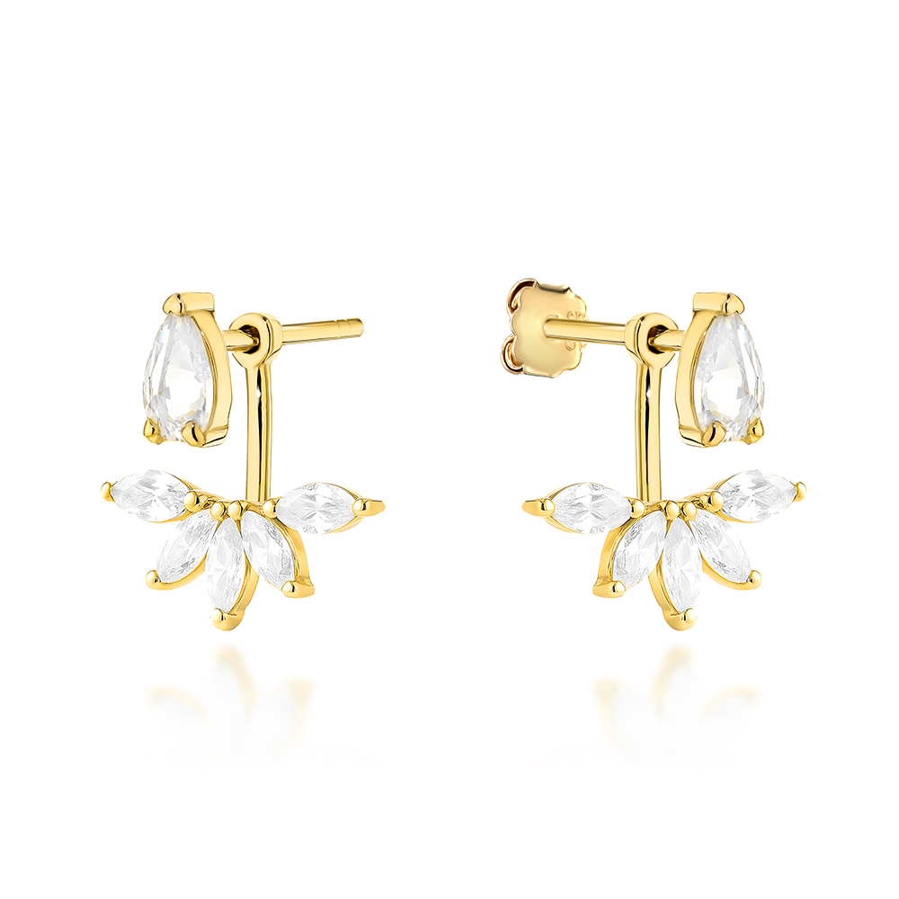 Delikatne złote kolczyki w kształcie listków, ozdobione subtelnymi cyrkoniami, przyciągają spojrzenia elegancją i świeżością. Dzięki praktycznemu biżuteryjnemu zapięciu, są nie tylko stylowe, ale i wygodne w noszeniu każdego dnia.