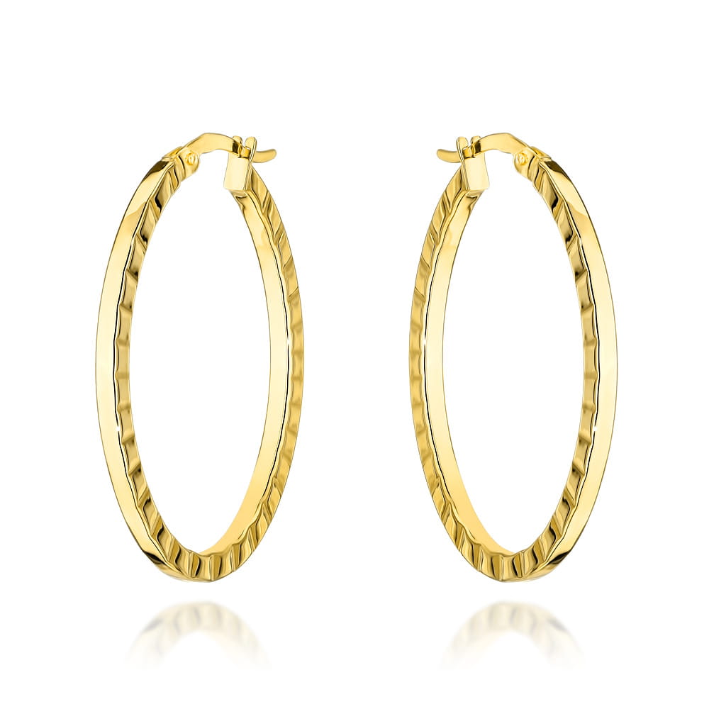 Złote kolczyki owale z delikatnym żłobieniem po bokach to elegancki dodatek, który podkreśli subtelność Twojego stylu. Idealne na wieczorne wyjścia i codzienne spotkania, zapewniają niezwykły blask i komfort noszenia.