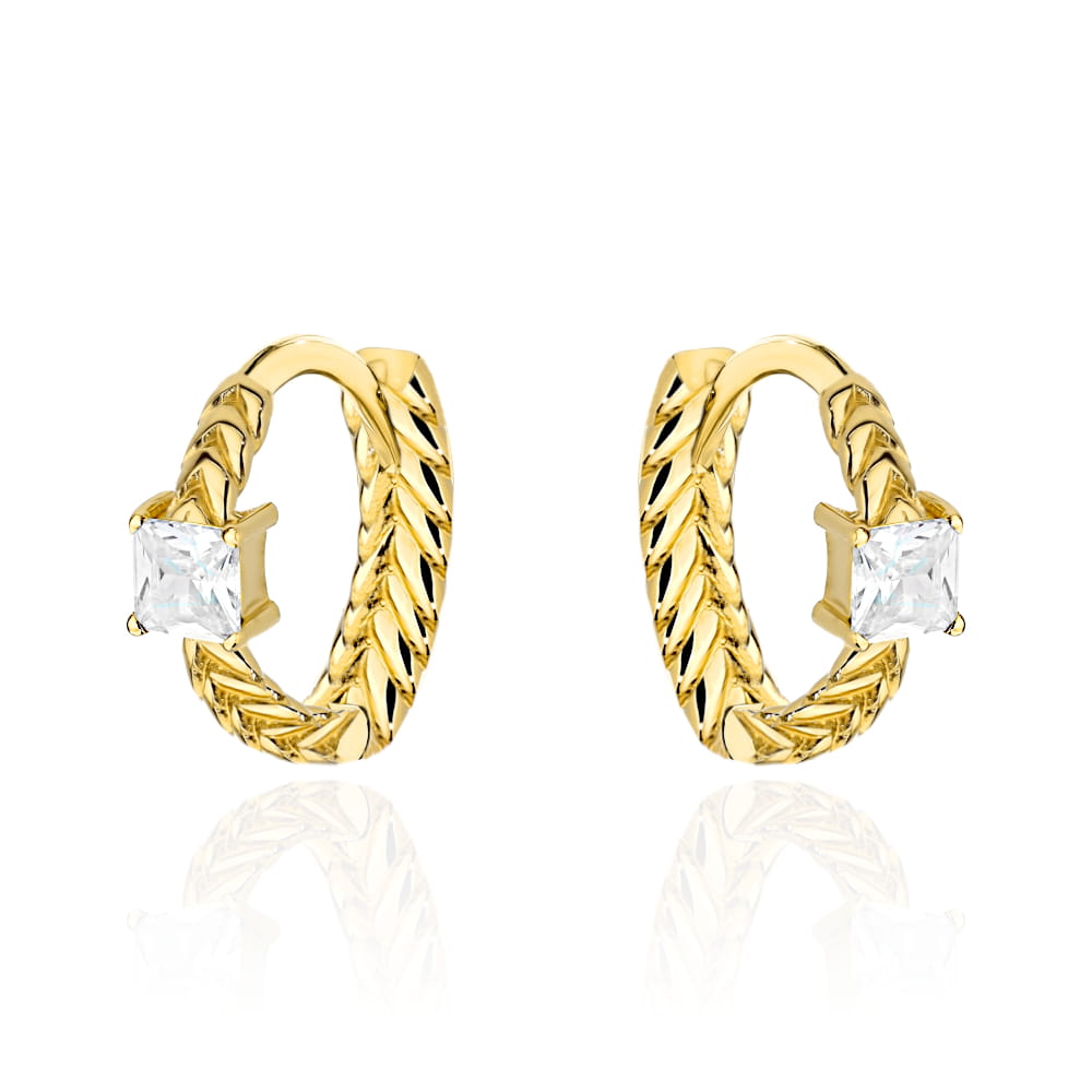 Delikatne, złote kolczyki plecione w eleganckim wzorze, zdobione subtelnym kamieniem – idealny akcent dla każdej stylizacji. Dodaj je do swojej kolekcji i podkreśl naturalne piękno swojego wyglądu.