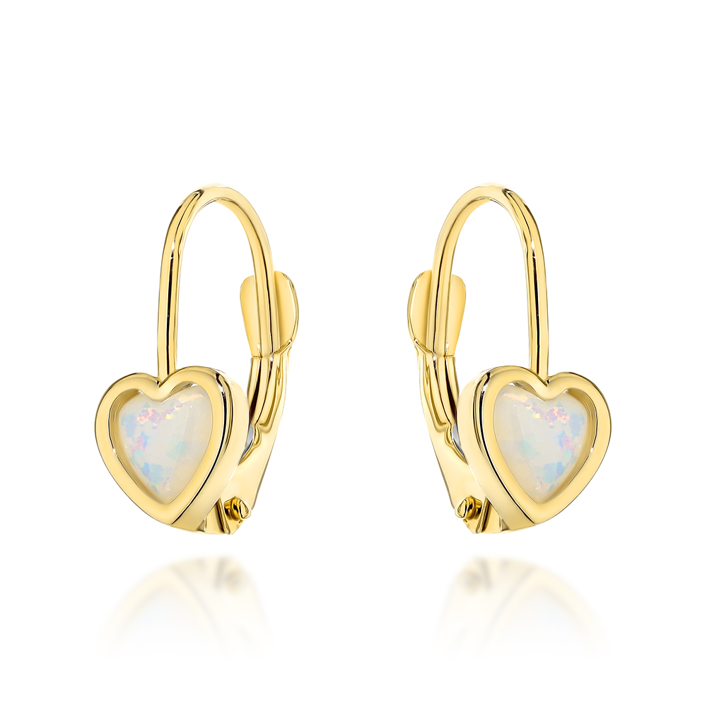 Kolczyki z delikatnymi serduszkami w złocie, zdobione opalitem o subtelnej, rozgwieżdżonej aurze. Idealne na eleganckie wyjścia i codzienne akcenty, zapewniające blask i romantyczny urok w każdym detalu.