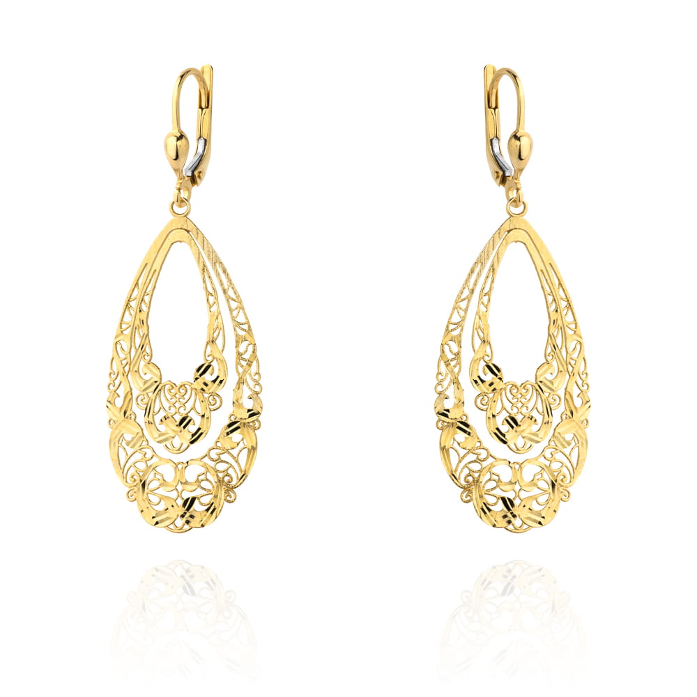 Kolczyki złote wzorzyste ażurowe to delikatna połączenie klasyki i nowoczesności, które podkreśli elegancję każdej stylizacji. Dzięki subtelnej fakturze i wyrafinowanemu wzorowi przyciągną spojrzenia, zachęcając do podkreślenia własnego szyku.