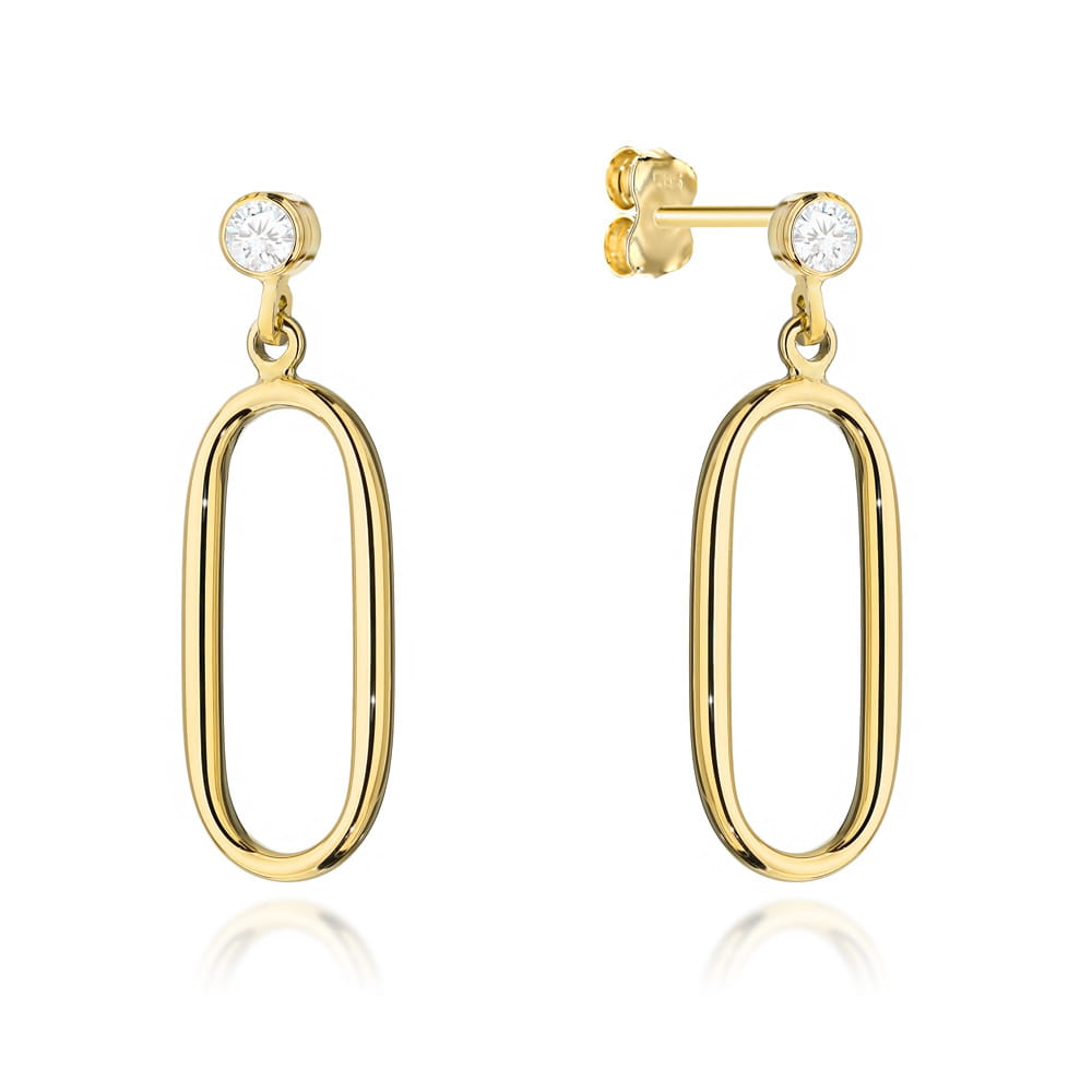 Kolczyki złote z cyrkonią i wiszącym owalem to elegancki dodatek, który podkreśli każdą stylizację. Złoty blask i delikatne ozdobne kamienie sprawią, że poczujesz się wyjątkowo każdego dnia.