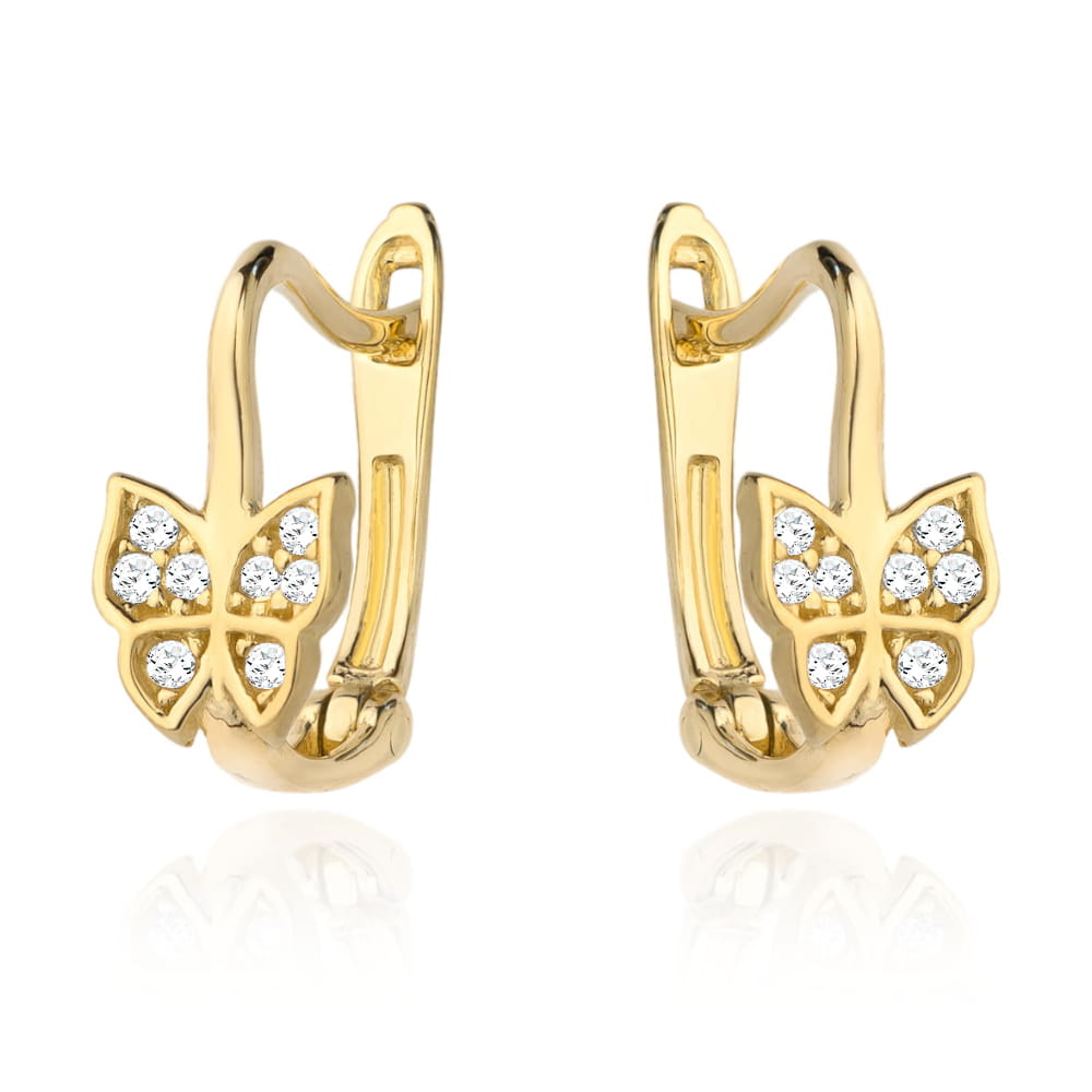 Zachwycające kolczyki w kształcie motyla, wykonane z eleganckiego złota i zdobione rozświetlającymi cyrkoniami, oferują subtelny blask na każdą okazję. Dzięki wygodnemu zapięciu angielski, noszenie ich staje się łatwe i bezpieczne, a całość podkreśla indywidualny styl każdej klientki.